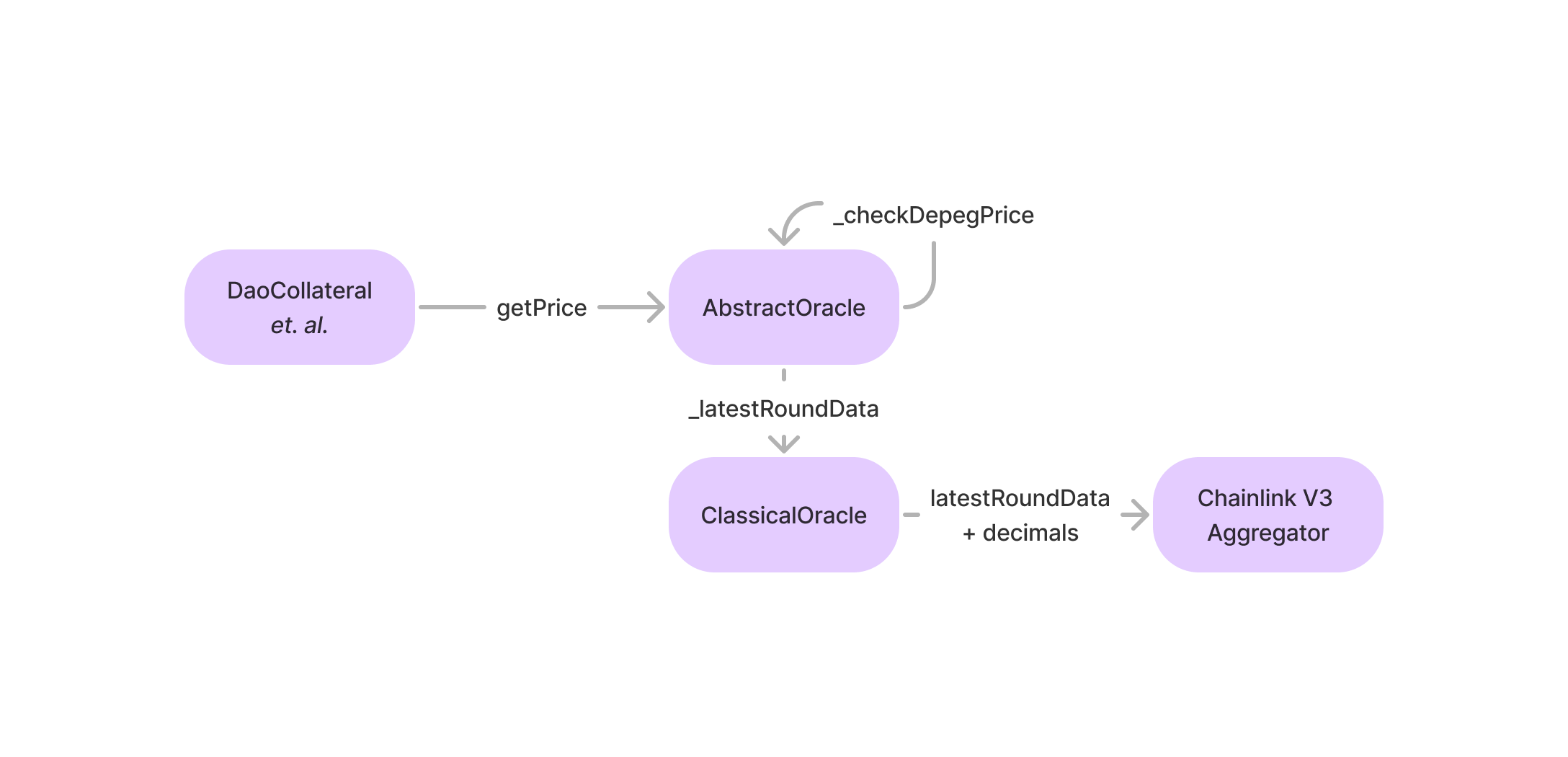 When another contract or external service calls getPrice or getQuote, the inherited AbstractOracle contract calls the virtual function _latestRoundData passing the desired token as parameter. This function is implemented in ClassicalOracle and retrieves the associated price aggregator for this token, then calls decimals and latestRoundData which are returned to AbstractOracle.